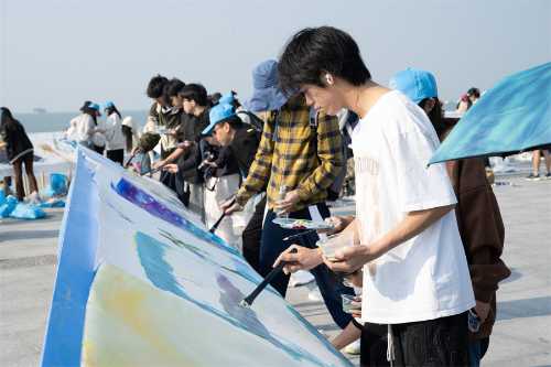 在创作现场,我校美术学院师生手握画笔,面朝大海。以十人为一组,以各自的绘画技巧和独特的创意,以他们无比的激情和活力共同绘就一幅幅10米长卷的画作。他们用色彩和线条,勾勒出了北海的美丽景色和银滩的独特魅力,将银滩潮雕广场变成了一个艺术的海洋,与面前的银滩碧波相映生辉,也为2023年“文化北海”建设活动周增添了一抹青春的色彩。