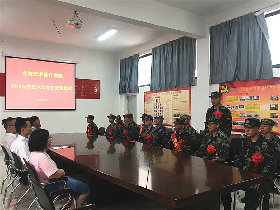 9月12日下午,我校举行2019年在校入伍学生欢送仪式。学校校长助理张帆,学工部部长刘承初,学工处处长王明森,学工处副处长刘玲花、班媚,服装学院副院长唐道明以及14名应征入伍新兵出席仪式。仪式由学校学工处处长王明森主持。
